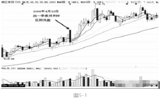 如图5-1所示,浙江东日(600113)利用2009年4月22日出的一季度报表所公布净利润同比增长28.04%,主力借助该利好洗盘,高开后使用大阴线砸盘,导致全天振幅高达11.62%。而在4月23日该股则快速企稳,完成一日洗盘。