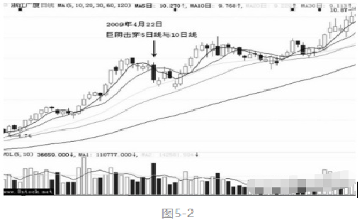 如图5-2所示,浙江广厦(600052)自2009年行情启动以来,该股已经实现了翻番,涨幅巨大,获利盘较多。从4月13日开始,该股连续震荡一周,4月22日突然杀出一根大阴线线,全天震荡高达11.95%,跌幅8.37%,换手率达8.09%,成交量接近前几日的两倍,在图形上连续跌破5日线与10日线,并且使5日线快速死叉10日线。