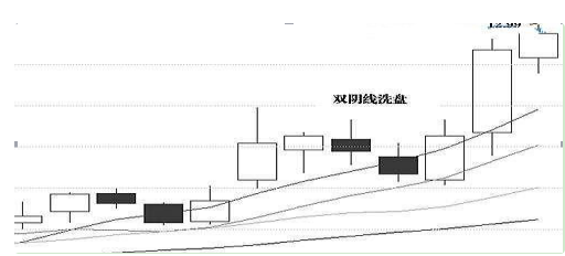 “双阴洗盘”形态:跳空双连阴是主力利用K线图的“跳空双K线”制造出的洗盘陷阱,这是一种非常凶悍而快速的洗盘手法,主力用跳空双连阴快速清理盈利的筹码、浮动的筹码。