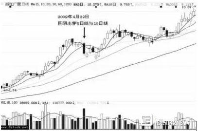 如上图所示,浙江广厦(600052)自2009年行情启动以来,该股已经实现了翻番,涨幅巨大,获利盘较多。从4月13日开始,该股连续震荡一周,4月22日突然杀出一根大阴线线,全天震荡高达11.95%,跌幅8.37%,换手率达8.09%,成交量接近前几日的两倍,在图形上连续跌破5日线与10日线,并且使5日线快速死叉10日线。