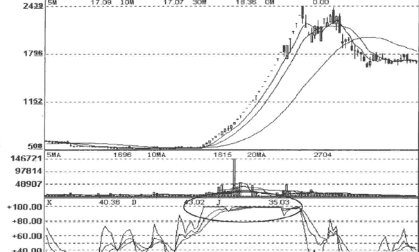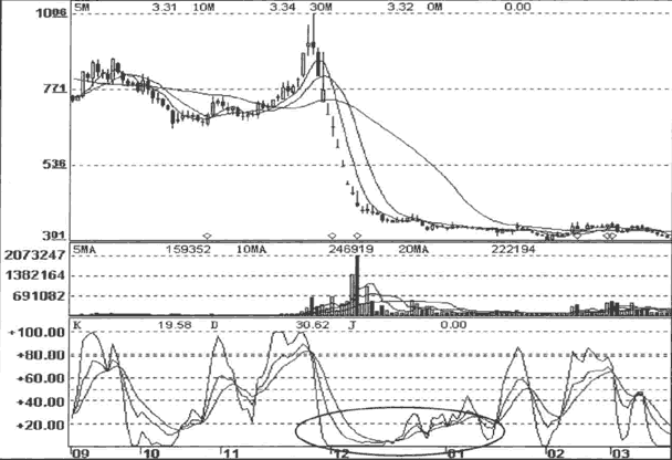 如图,海虹控股(000503):在整个上涨过程中,KDJ指标在高位钝化时间如此之长是十分罕见的,说明庄家完全控盘,且志在高远。庄家在底部吸纳了大量的低价筹码,经过拉升前的预演和充分的洗盘调整后,股价进入主升浪阶段,上涨势头如虹,跳空高开,连封涨停。KDJ指标迅速到达强超买区域,J线钝化后不久,K线和D线也随之钝化。按照KDJ指标的一般作用法则,此时是卖出时机。然而,股价却不理会KDJ指标的高位钝化,超强上攻,飙升而上,短期涨幅接近400%,涨得让你不敢相信,一时间成为沪深两市的明星股。