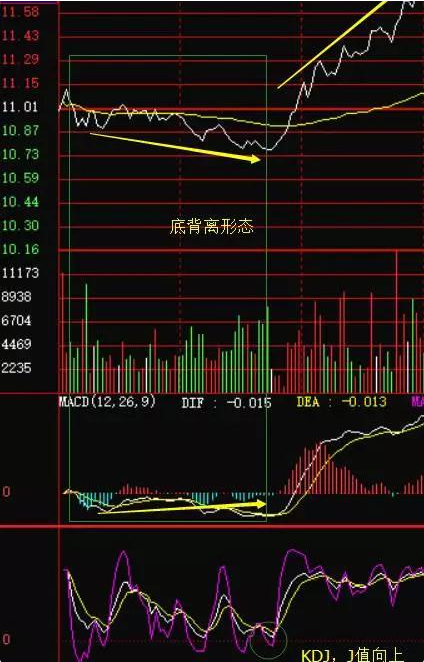 当价格出现低背离格局的时候,KDJ的J值钩头向上,则上升空间较大。