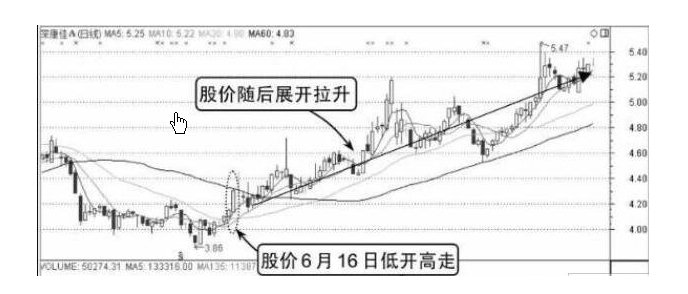 2、股票在低位的话,当日的低开高走多数情况下是确认下方支撑,因而在后续的走势中我们就能看到该股在这个位置企稳或者反弹,所以低位的低开高走往往都是行情启动的标志。