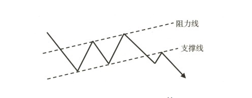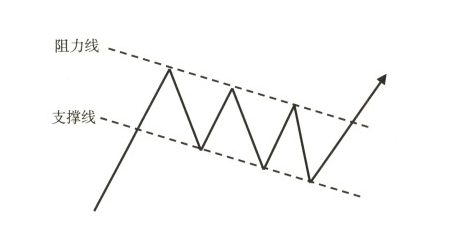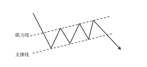 旗形是与楔形相似的一种形态,二者的区别在于支撑线的倾斜角度。也就是说,旗形的两条边线近似平行线,这是与楔形最显著的区别。如下图所示。