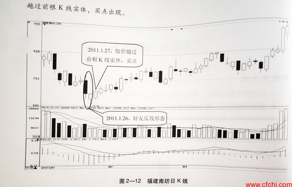 如图2--12所示,在经过一波下跌走势之后,2011年1月26日,福建南纺( 600483) 出现了好友反攻形态,发出看涨信号。1月27日,该股股价继续上涨,并越过K线实体,买点出现。