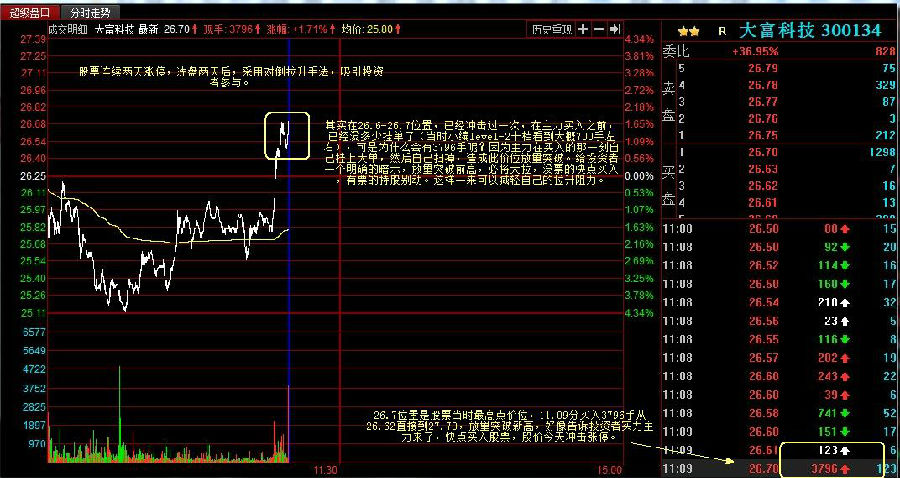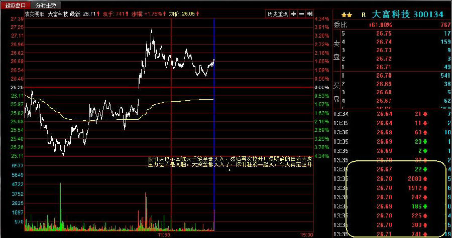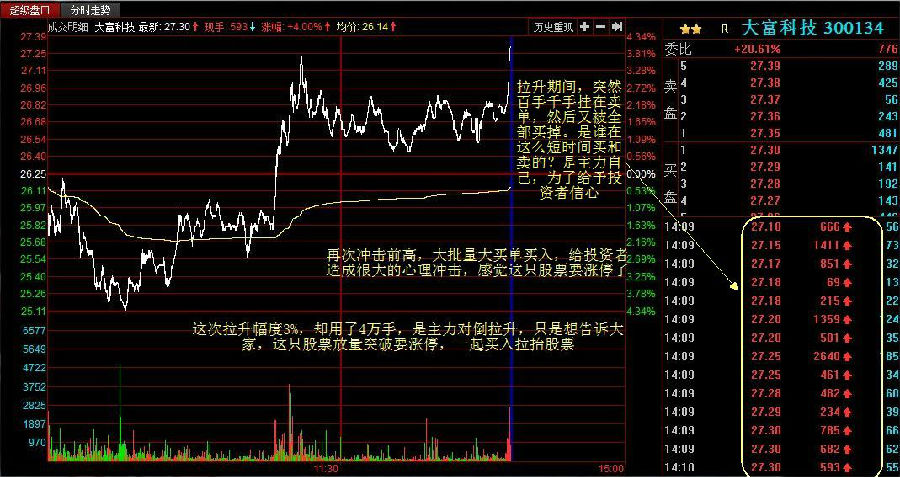 (2)在股票拉升期,突然出现很多百手千手甚至万手的卖单,可是有一股强大力量照样全部吃掉,成交量放大的突破前高。谁在这么短的时间又挂卖单又买单,完全不顾成本和抛压?当然是主力自己所为,所以不用顾虑这些,他的目的是吸引投资者买入,一起拉抬股价。