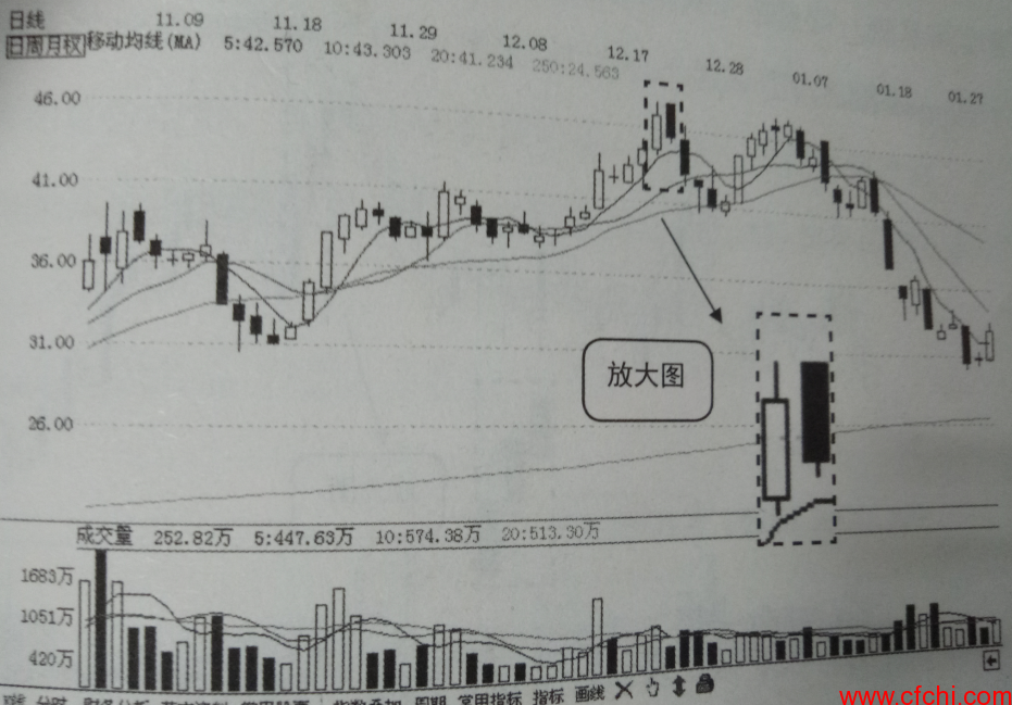 (2)第二天股价出现高开,但高开后一路走低,最终收阴线,损失掉前一天阳线的大片领地。