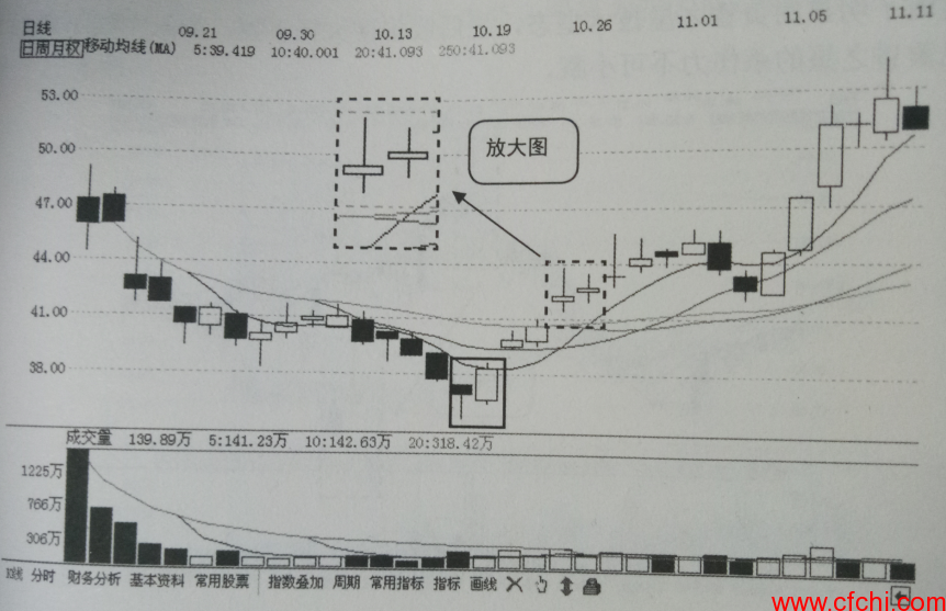 (2)阳线后连续出现两根或两根以上的跳空十字星K线。