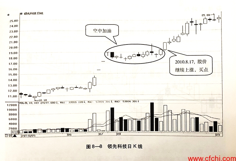 如图8-8所示,2010年7月底至8月初,领先科技(000669)经过一段时间的快速上涨后开始在顶部放量横盘,形成了空中加油形态。这个形态说明主力在顶部积蓄力量,准备将股价继续向上拉升。8月17日,空中加油形态完成,股价继续上涨,此时买点出现