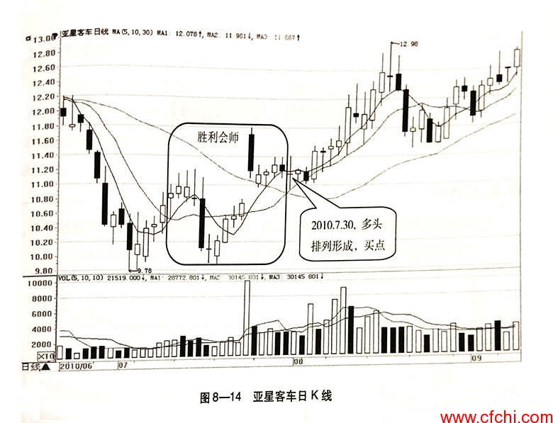 1.在移动平均线胜利会师的过程中,如果成交量持续放大,则说明股价下跌后获得了多方有力支撑。这样的情况下该形态的看涨信号会更加可靠。