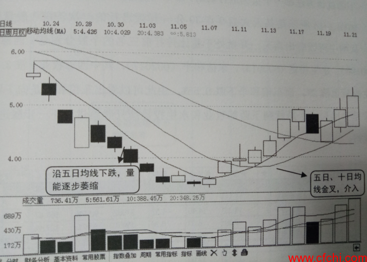 如图下所示是国兴地产(000838)的日K线图,图中显示该股沿五日均线连续下跌过程中量能逐步萎缩,直到底部股价突然跳空上涨,之后连续放量上涨,形成较为明显的V形反转。