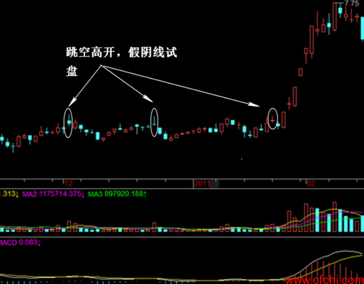 这种建仓完毕后,正式拉升前的试盘表现在K线上就是一根带长长上影线的K线或者是跳空高开的假阴线,这种假阴线,我们称之为“倒拔杨柳”。
