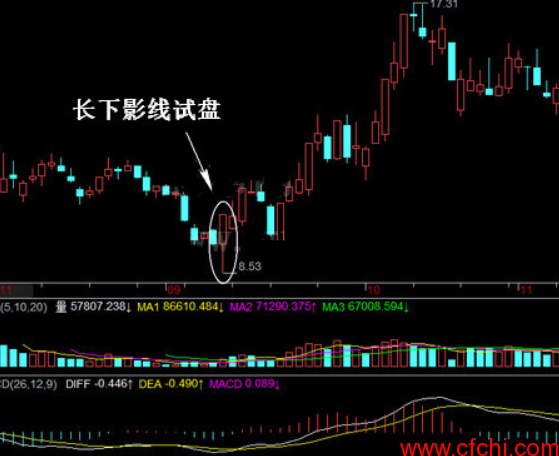 主力在有准备的情况下,将手中已用的少量的筹码出其不意地抛出,将该股的股价大幅打压,以便观察有多少恐慌盘抛出或者有多少场外的跟风买盘对它的低价位感兴趣而买进,以此了解打压该股的下档支撑极限。如果打压超出限度,因打压而卖出去的低价筹码可能就无法再次买回。具体表现在K线上就是风平浪静的走势中突然出现一根长长的下影线。其目的是在正式建仓前测试场外跟风盘的买入力度,界定打压极限。