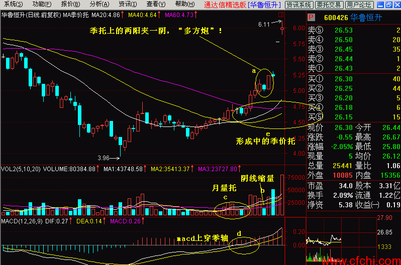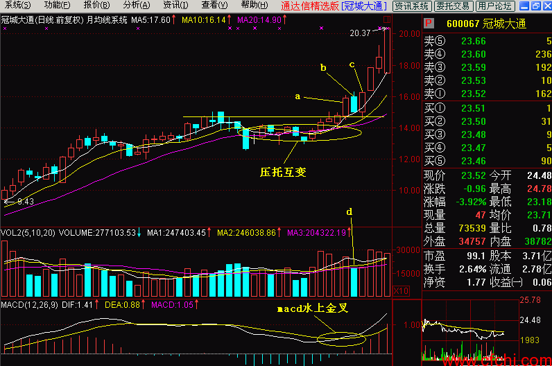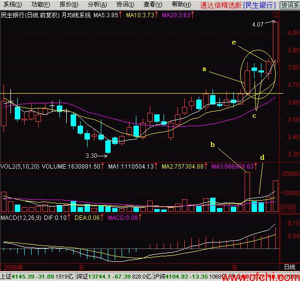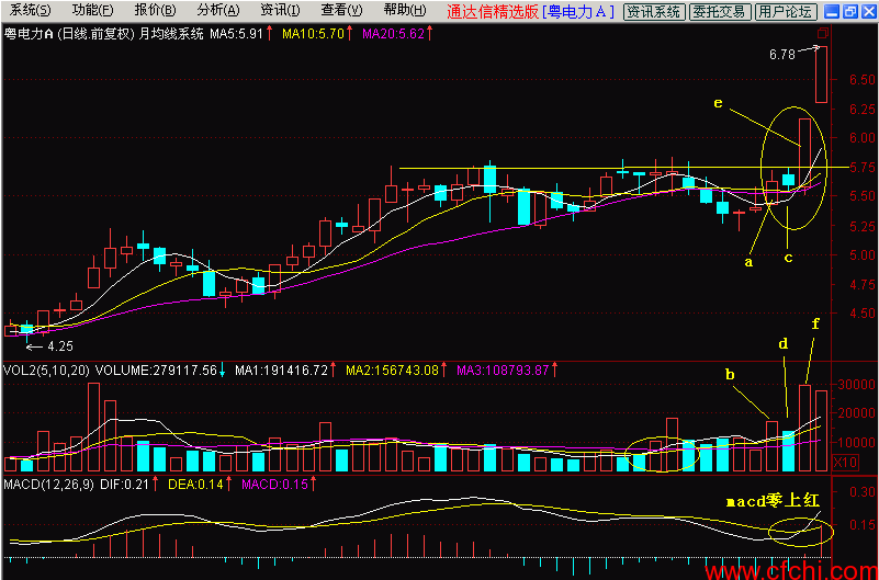 见图(3-4),图中a所指的一根小阳线突破了月均线系统,所对应的成交量有一定的放大(见b所指处),股价当天曾悄悄地试探了一下盘整平台的T线压力,第二天股价高开后也曾小心翼翼的试探了T线压力,然后轻轻的放下,反压了被突破的月均线系统,整个小阴线被压制在T线之下、均线之上的狭小区间内(见c所指处),成交量相对萎缩(见d所指处),至此股价已经离盘整平台的压力线相当之近了,只要一放量就可以冲过去,但他就像一头猎豹接近猎物那样的小心翼翼。老师常说要“跳一跳、够得着”,他现在根本不用跳了,只要头一抬就能过去。果然在第三天开盘后经过短暂的下探后拉起,一路突破T线直奔涨停(见e所指阳线),成交量也放大到两倍量的水平(见f所指量柱体),macd指标也是零上红金叉了,该股当天完成多方炮组合的同时,当天就开炮了!以至于第四天仍然跳空后涨停,又是一根光头光脚的阳线。