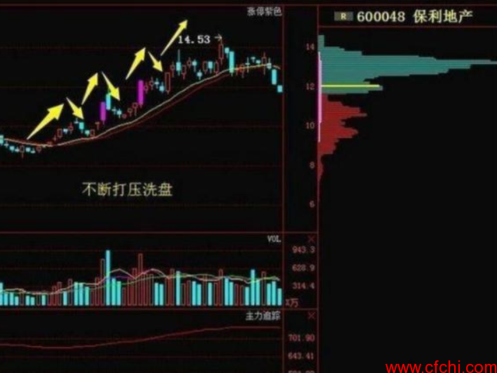 引起洗盘的根本原因,就是股价上涨遭到散户的抛压,多空意见出现分歧。因为市场刚刚脱离底部不久,熊市思维依然困扰着广大散户的持股信心,也就是说牛市气氛没有形成,不可能有强烈的持股愿望,这样势必会出现抛盘,这时庄家不可能用钱去阻止股价下跌,只能顺势而为,加入到高抛低吸行列之中。比如,股价从7元涨到10元,此时市场跟风盘减少而压力加大,那么,庄家会在10元附近减仓一部分筹码,当股价回落到8元附近时重新买回一部分筹码,然后股价再次回升,这样庄家仓位基本没有变化,但已经成功地赚了2元的差价。