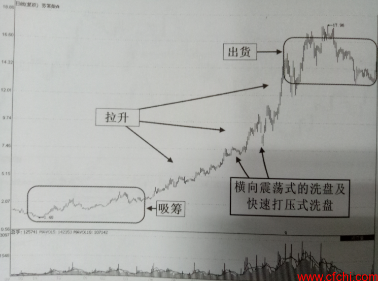 如图所示为苏常柴A2008年9月至2010年1月期间走势图,图中标示了主力对此股控 盘的各个环节,通过这种各环节式的划分,股民对主力的一能控在过程就可以看得更明确,对于个股走势的把握也能更为精确。