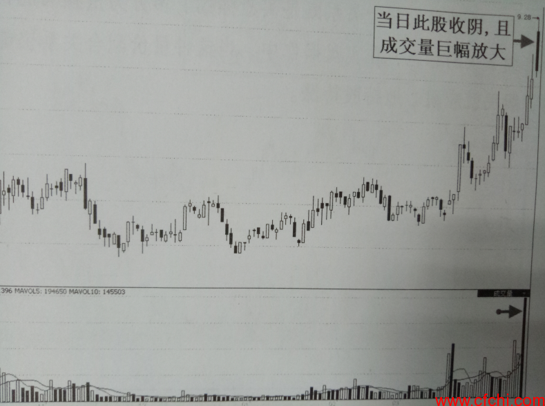 此时,可借助于成交量。可以看到,当日的成交量出现了大幅度的放出,结合此股高开走低的这一情况,可以说,这是市场抛压十分沉重、抛盘如注的信号,是个股在快速上涨过程所遇的阻力极大的体现。通过量能的变化可以知道:此时是一个短线卖股时机,不宜再持股。