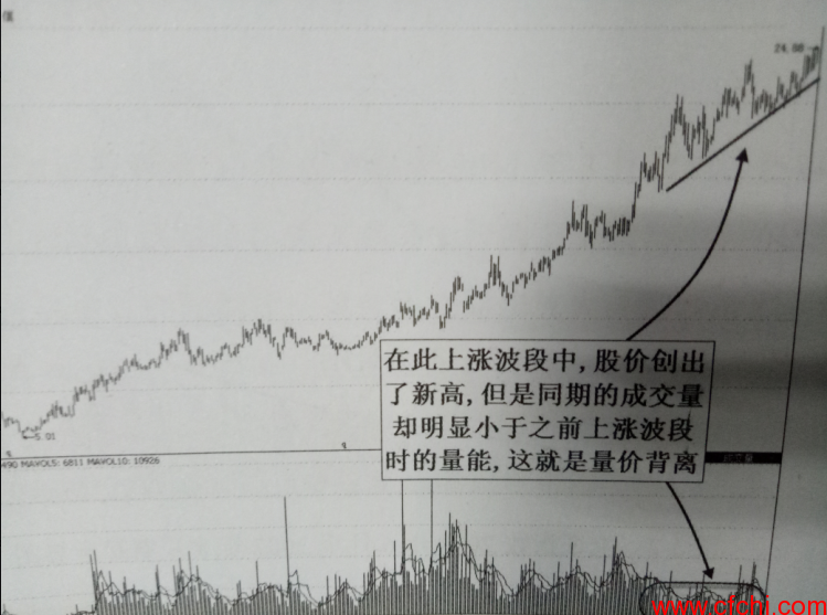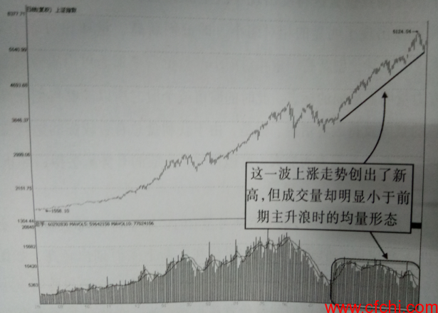 如图2所示为上证指数2006年8月至2007年10月期间走势图,股市在大课后的高位区也出现了这种形态鲜明的量价背离配合关系,这同样是股市上涨动力威弱、升势即将见顶的信号。在实盘操作中,此时,股民应逐步诚仑离场,保住牛市中所获取的利润。