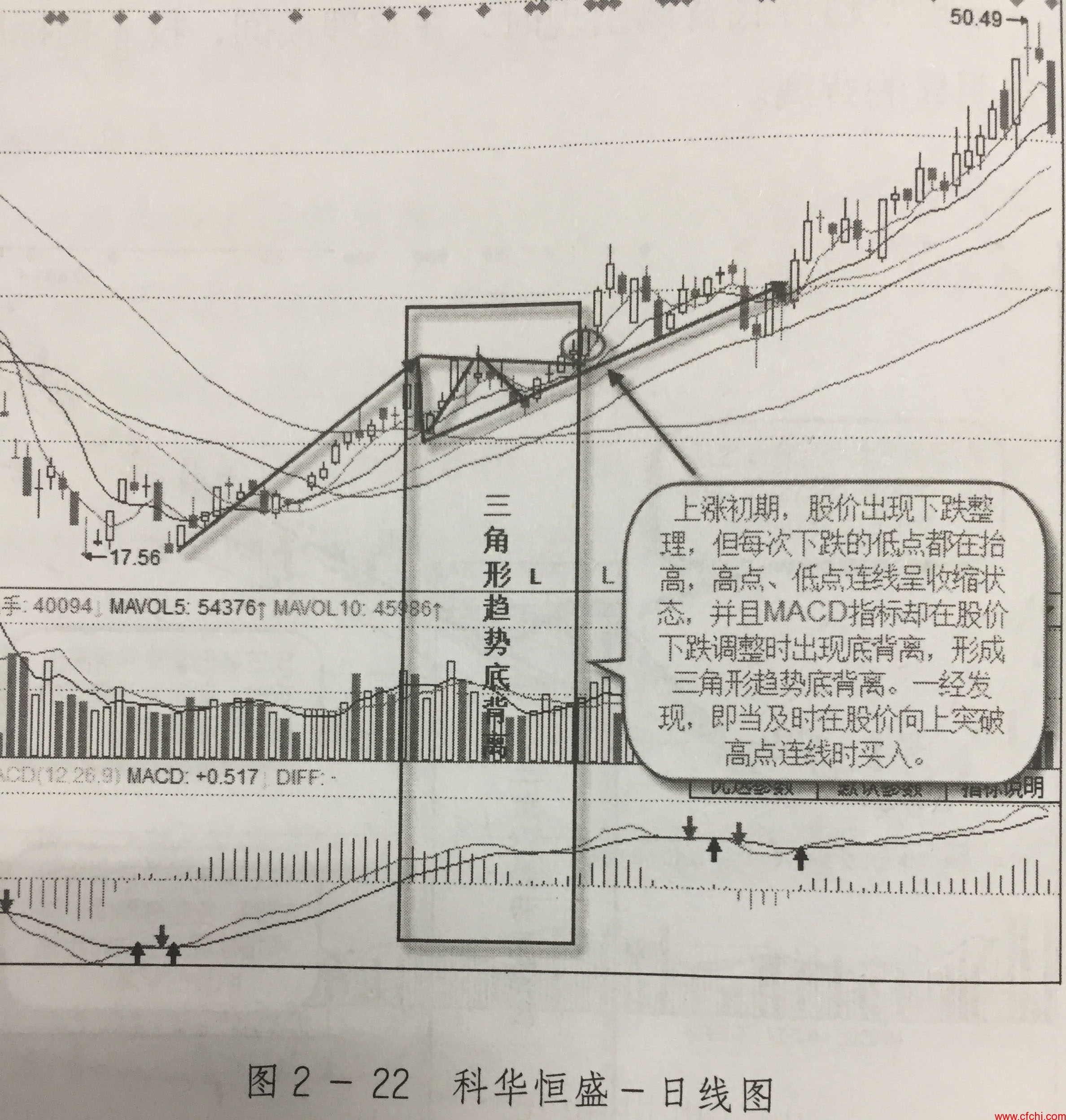 经过前期的下跌后,科华恒盛在2015年10月明显走出低位区,开始上涨,但在10月20日有了一定涨幅后,股价开始调整,但每次下跌后形成的低点都在不断被抬高,且在股价下跌时,技术指标MACD都出现了底背离。如果此时将调整时的高点连接在一起,再次反弹的高点连接一起,则形成-一个三角形,这就是三角形趋势底背离形态。这就说明股价在调整过程中,受到了资金的大举买入,使得技术指标出现了背离。因此,投资者应当发现后,及时买入股票,如图2 - 22所示。