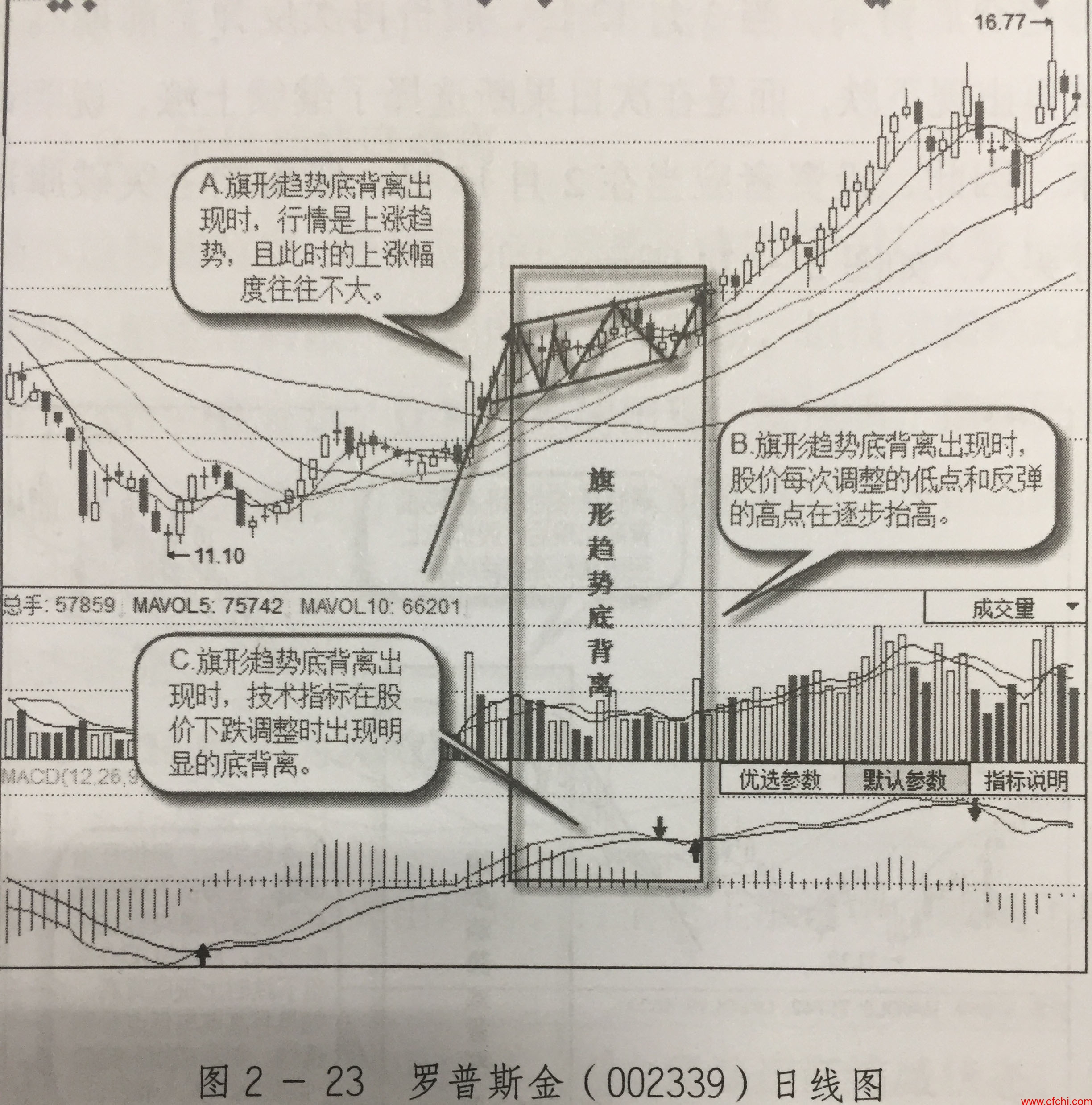 在离开底部的上涨趋势中,罗普斯金在2015年2月13日开始下跌调整,遇支撑后反弹,且每次下跌时出现的低点,以及反弹的高点,都在被不断抬高。并且,在股价出现下跌时,MACD指标并没有改变向上运行的趋势,与股价趋势出现底背离。此时,如果将调整的低点、高点分别连线,K线上即会出现一个旗子的形状,形成旗形趋势底背离。当3月12日,股价再次反弹至前期高点时,却没有再出现下跌,而是在次日果断选择了继续上涨,说明调整已经结束。因此,投资者应当在2月13日,股价向上突破旗形高点连线时买入,如图2 - 24所示。