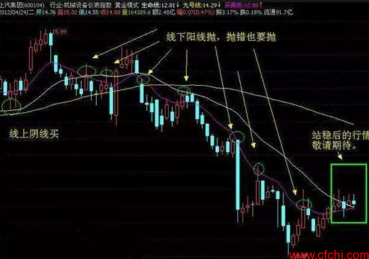 "线上阳线抛",要满足两个要求,即股票跌破该均线;在其后几个交易日,股价将回抽这条线,形成一条阳线,开始放量要及时出场。