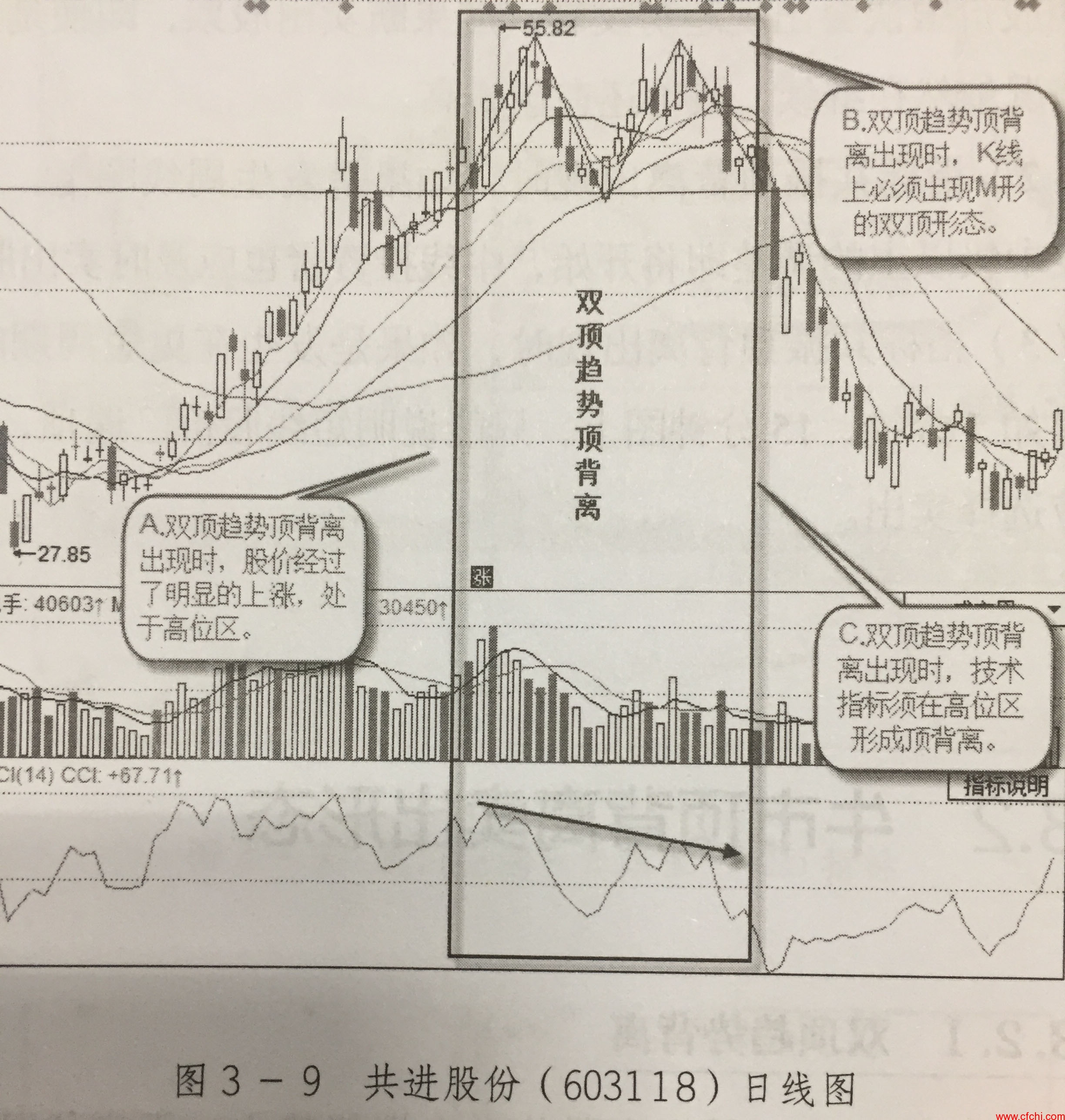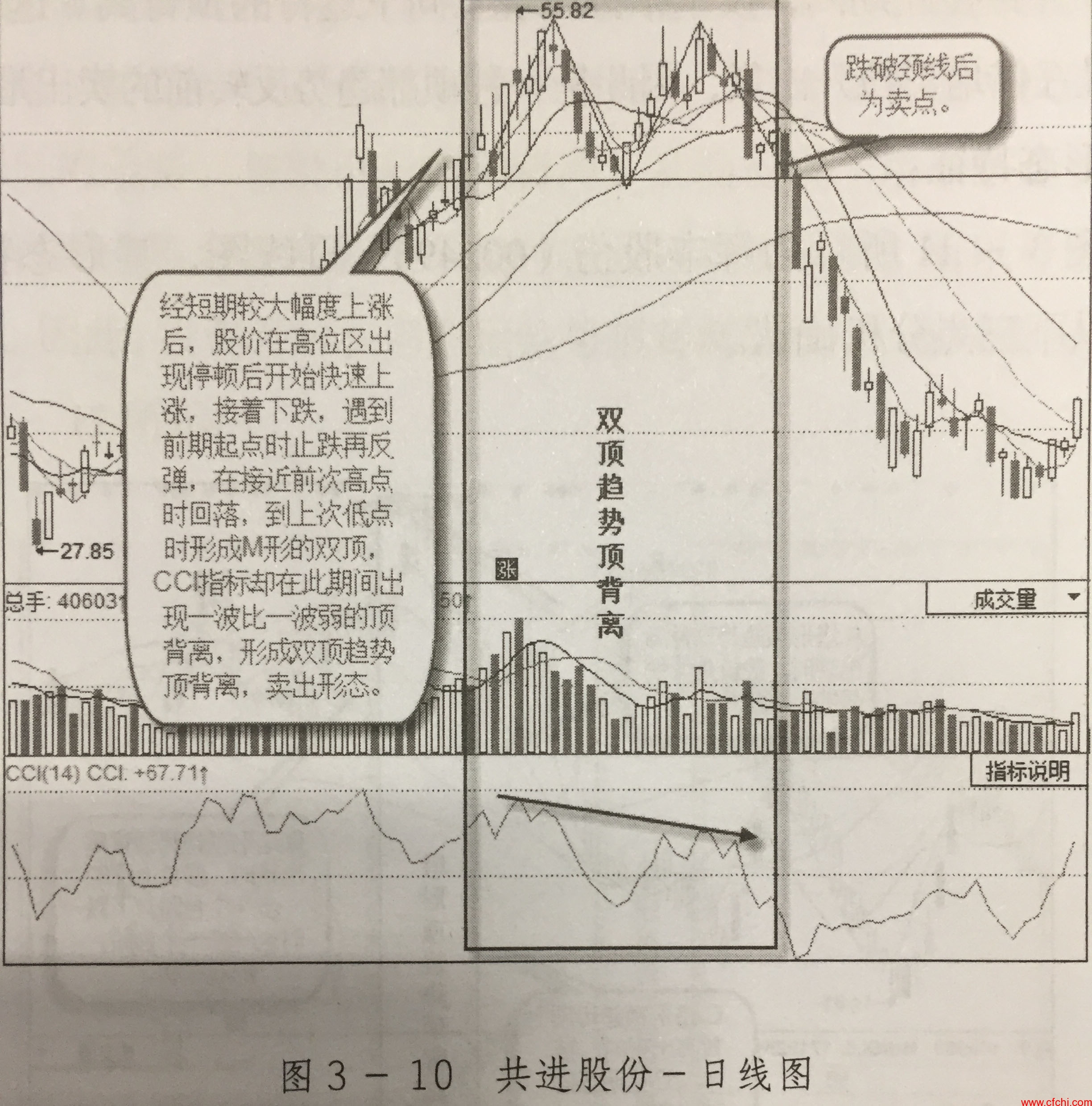 经前期明显上涨后,共进股份于2015年11月27日略事调整后,出现快速上涨,至12月4日时开始回落, 但到12月14日接近11月27日的位置时出现止跌,其后开始反弹,但反弹至前期高点附近时未能创出新高即开始回落,在12月31 日股价接近11月27日及12月4日的位置时,却出现了一路下跌,K线上出现了M形的双顶。然而,在此期间,技术指标CCI却一直处于一波反弹高点比一波弱的震荡向下运行,与股价形成明显的顶背离,从而形成双顶趋势顶背离。因此,投资者应在形态确立后,股价向下跌破颈时果断卖出,如图3 - 10所示。