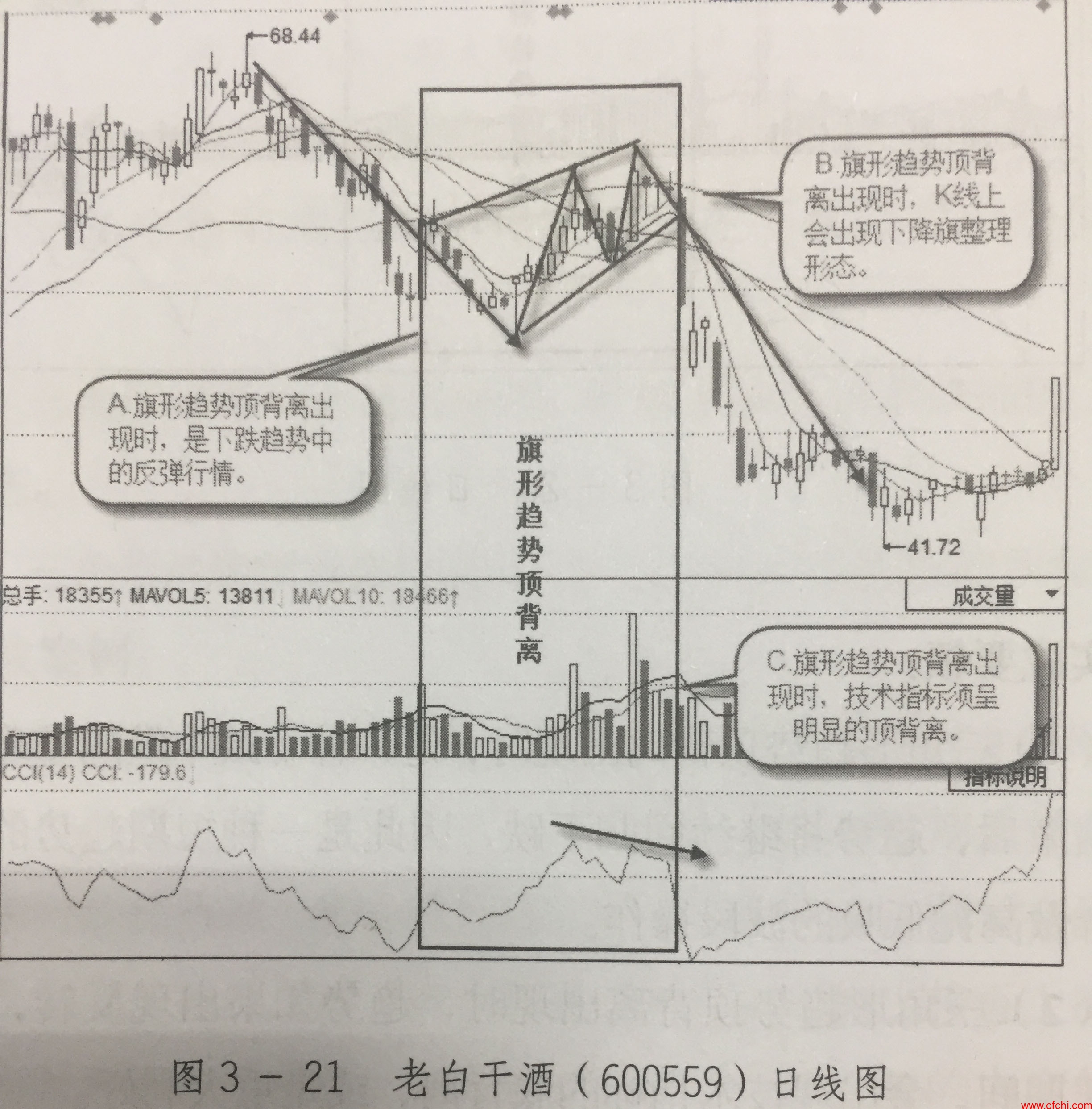 图3- 21所示为老白干酒600559)日线图,其形态特征可以从以下三点分析确认。