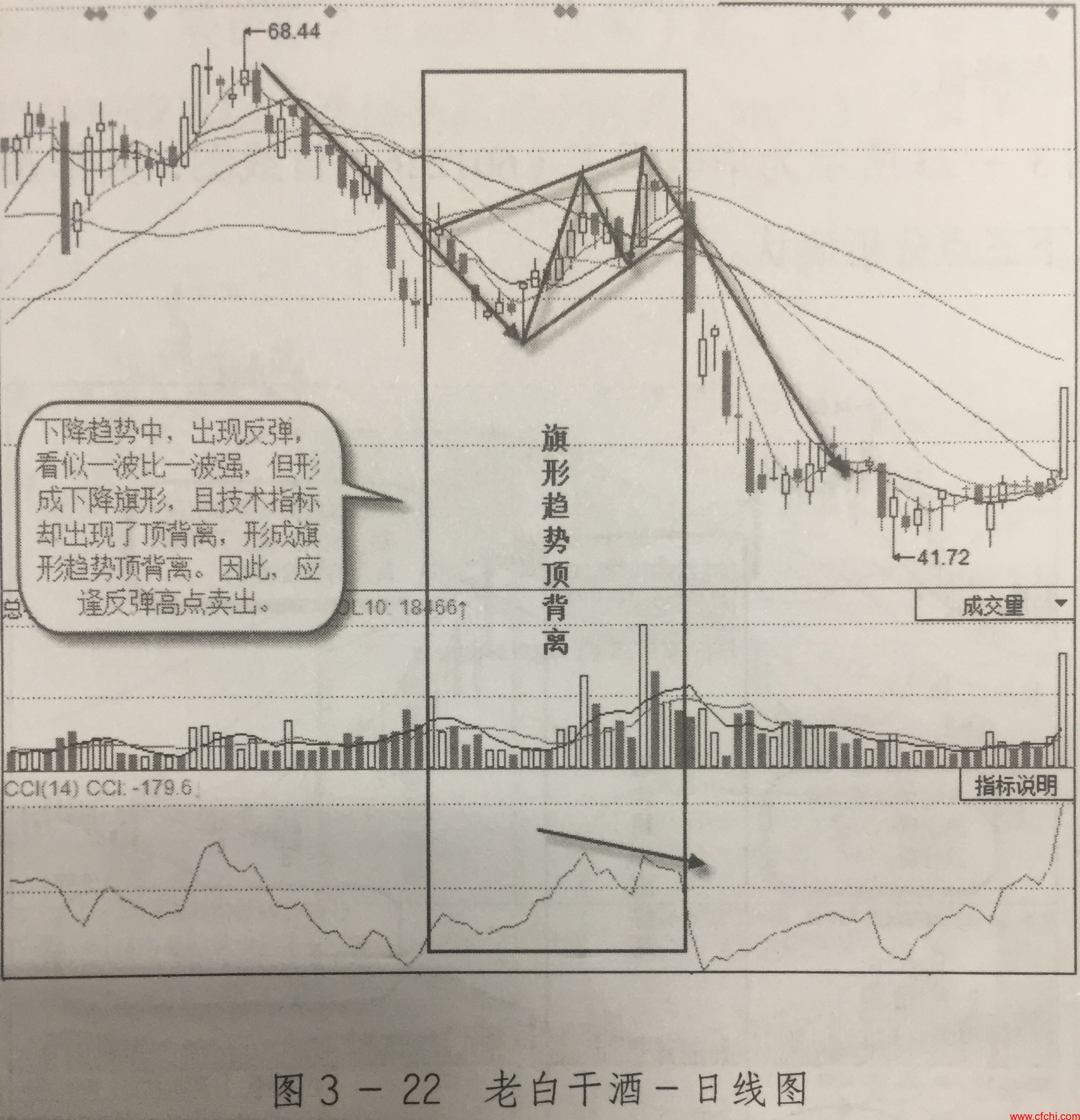 经历了2015年11月中旬至12月月初的下跌后,老白干酒于12月9日时开始止跌反弹,并且,一波比谈比一波强,调整低点也在被不断抬高,如果将其高点、低点分别连线后,像一面一批倒立的旗子,形成下降旗形整理形态。与此同时,技术指标中CCI却出现了明显的波反弹比一波弱的下降趋势,形成旗形趋势顶背离。这说明主力在借旗形整理中的反弹拉高出货,所以导致了CCI指标的背离。因此,投资者应当在旗形整理时选择逢高卖出股票,如图3 - 22所示。