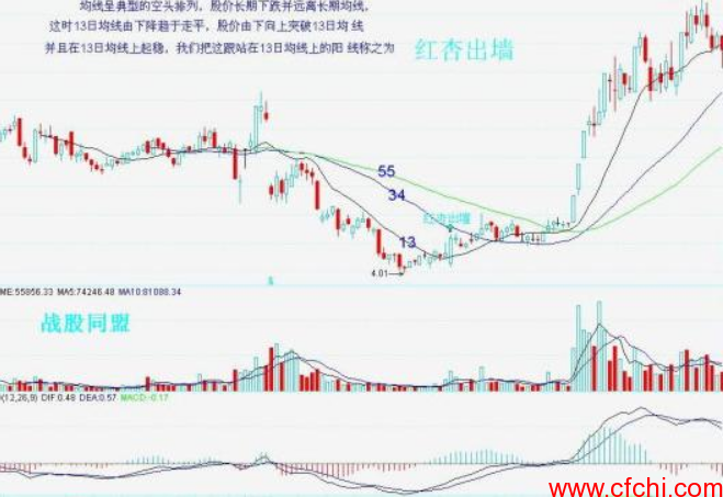 形态特征:13日均线由下降趋于走平。股价从下向上突破13日均线,并且在13日均线上企稳,这根站在13日均线上的阳线称之为“红杏出墙”。红杏出墙是第一买点,也是行情最初启动点。