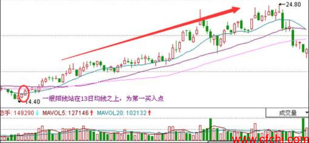 2、股价在下跌的过程中。如果没有【红杏出墙】出现,股价就根本没有底部可言。3、13日均线由跌趋走稳以后,股价一般要围绕着13日均线上下波动几天,而股价在13日均线上企稳后,k线多以小阳或中阳形态向上推进,显得很有节奏。