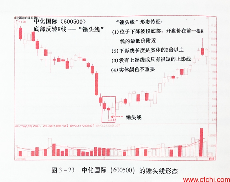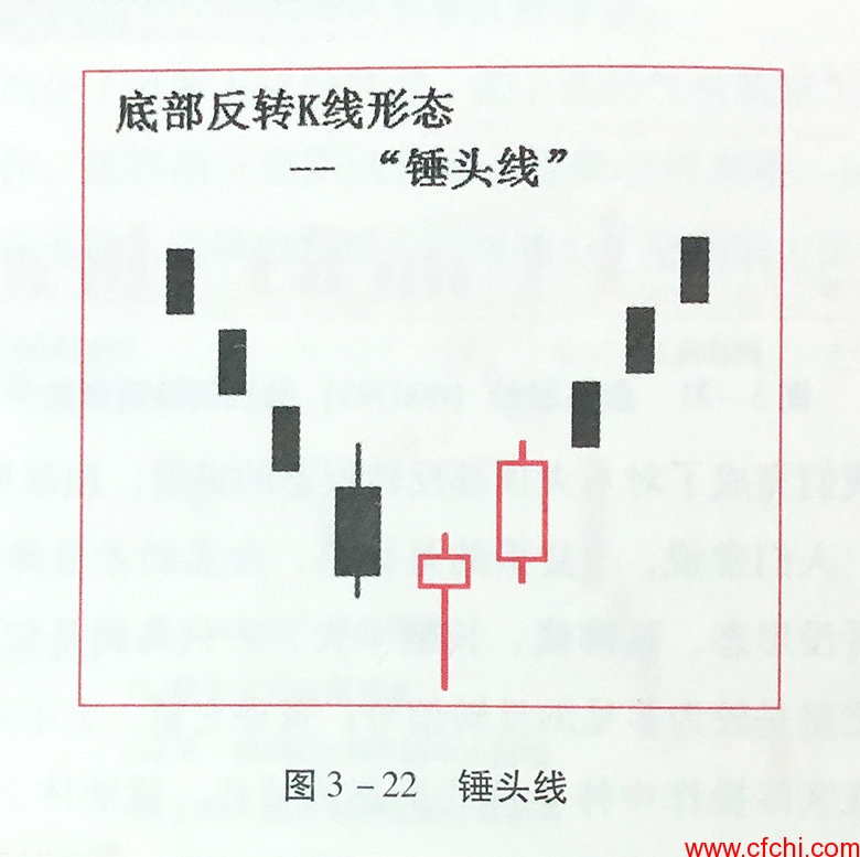 “锤头线”是发生在波段底部,单根K线显示可能反转的K线形态,其形如锤头朝上的锤子一样。如图3-22所示。