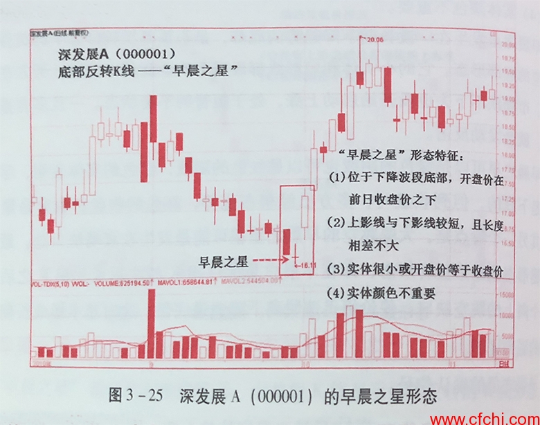 的小星线,前一天看似的来势汹汹并没有继续,市场好像孕育着新的希望。这个小星线就是早晨之星也叫启明星,它是经过连续长期下跌之后,波段见底的信号。稳健的投资者可以不在当天买进,等第二个交易日确认短线好转之后再买进。