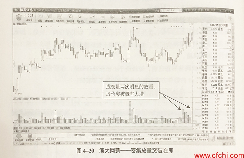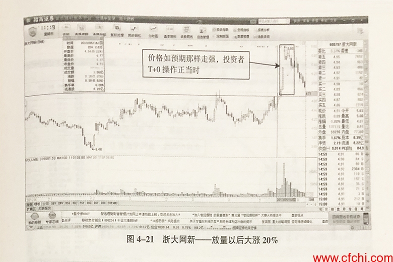 如图4-20所示,浙大网新的日K线中,价格连续放量回升的时候,投资者能够发现期间明显的两个成交量柱,明显是主力介入的信号。相比前期成交量的放大,这个时候的量能放大更具连续性,表明股价短线走强是可以持续的。如果这种放量回升的走势持续下来,价格高位的阻力显然已经不再是问题。成交量继续放大以后,投资者紧跟着T+0操作便可持续获利了。T+0的操作不容易在横盘期间获得利润,而一旦股价突破了横盘区域,那么投资者的盈利空间就打开了股价可以再突破横盘区域后持续上行,投资者在价格回升期间的T+0操作很容易获得高额回报,而股价在调整期间却也是不错的买点。