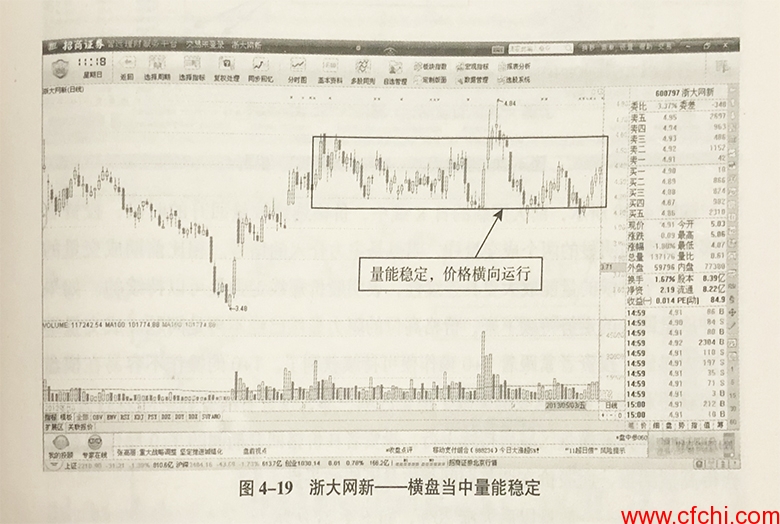在股价突破调整形态之前,短线的T+0操作没有问题,投资者将会持续获利。事实上,T+0的操作方式很适合投资者短线买卖股票。浙大网新——横盘当中量能稳定,如图4-19所示。