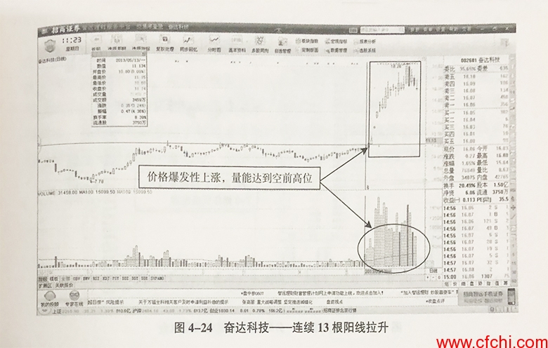 如图4-24所示,随着成交量急剧膨胀,股价连续拉出13根上涨阳线,投资者也因此获得丰厚利润。成交量的放大程度很高,明显是前期量能的3倍以上,而股价飙升的过程中,连续出现了两次跳空涨停板,也为投资者的获利提