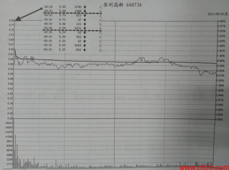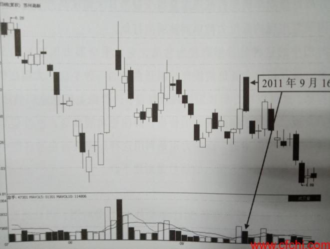 月21日至2011年10月10日期间走势图,当日此股正处于短期反弹中的相对高点,虽然涨幅不大,但短线获利拋压还是存在的。而这种盘面形态又是明确的短线下跌信号,因而,在实盘操作中,股民可进行短线卖股操作,等个股随后回调至一波低点后,再择机买回,如此可以顺利地实施一轮高抛低吸操作。