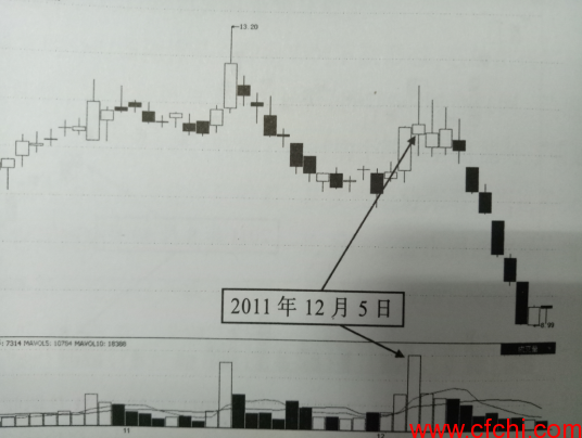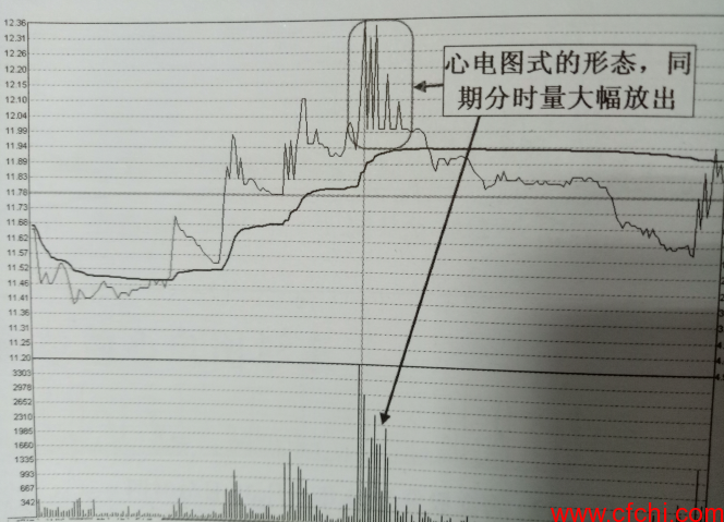 如图3所示为航民股份2011年12月5日分时图,当日此股在盘中高点出现了这种放量心电图形态,这种形态极为“不自然”,它已经脱离了正常市场交投下应产生的形态这一一范畴。其实,这正是主力对倒操作的产物,在实盘操作中,它是一鲜明的下跌信号。如图4所示为此股2011年12月5日前后的运行情况,从此股的日K线走势来看,当日正处于一被反弹后的高点,因而,当日的这种放量心电图形志预示着短期反弹走势结束,新一-轮下跌行情将展开,在实盘操作中,股民若参与了博取反弹操作,则此时应及时卖股离场,保住来之不易的短线利润。