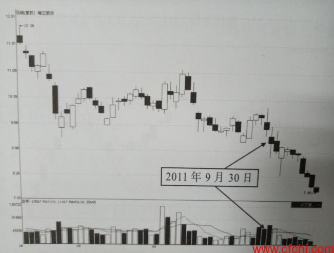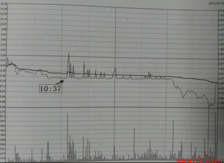 如图1所示为海立股份2011年9月30日分时图,在当日的盘口走势中,在早盘10; 37之后,可以看到,分时线开始以水平方向运行,期间不时出现偶然性小幅度的脉冲式跳动,整个过程中的分时量相对放大 这种量价配合关系正是有主力从中积极对倒运作的体现。在盘中对倒之后,此股在尾盘阶段还出现了大跌,这更是弱强的表现。从日k线走势来看,当日处于下跌途中盘整区低点,因而,当日的这一分时图形态预示着一轮破位下跌行情将展开,实盘操作中,股民此时绝不可短线抄底入场。如图2标示了此股2011年9月30日前后的运作情况。