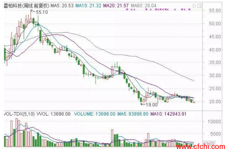 股价已经是处于非常明显的下降通道中,均线呈现空头排列。如下面这只个股,从周K线来看,均线呈现空头排列,股价是经历了两波较大的跌幅,由高位到目前的价位下跌超过60%,短期仍然没有见底的迹象。大家不妨计算一下,股价要回到原来的55.10高位,需要上涨多少?