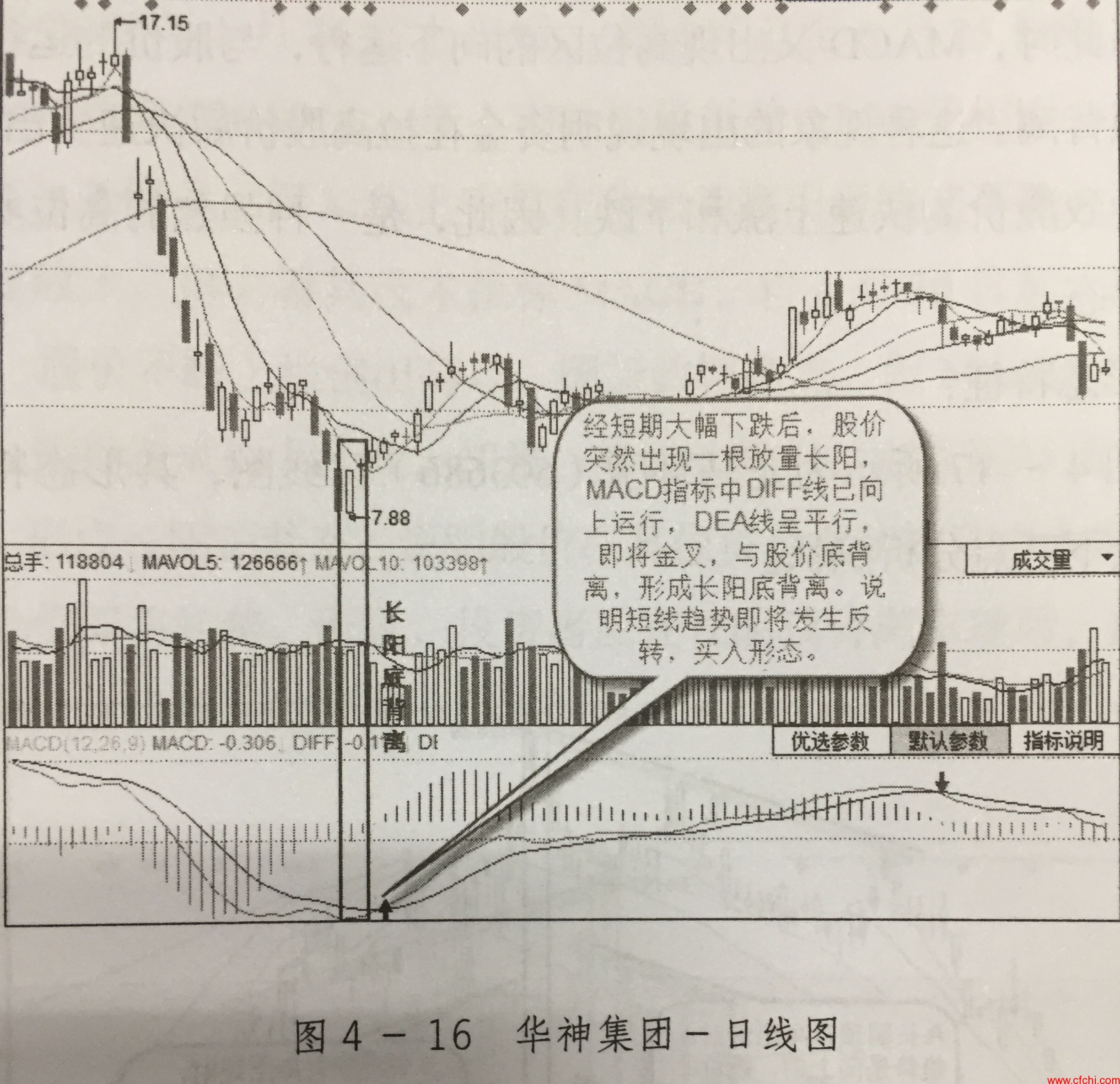 经过前期快速且较大幅度的下跌后,华神集团在2016年1月29日开盘后,再次快速下跌,延续了之前的下跌趋势,并在创出新低7.88元后,成交量开始放大为阳量,股价出现触底回升,并于当日收出一根较长阳线,成交量也呈阳量放大形态,并且,MACD指标中的DIFF线已明显向上运行,DEA线也在低位区渐渐走平,与股价走势形成底背离。由此,华神集团形成长阳底背离。这说明资金已认可此时的低点,开始大举介入,因此,投资者应在长阳底背离出现后,股价持续放量上涨时买入,如图4- 16所示。