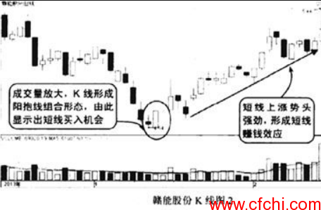 我们再来看看这张图,该股在下跌的结束位置形成了一个明显的阳抱线组合形态,随后伴随成交最的明显放大股价开始上涨,虽时有调整却并不影响上涨趋势,并连续收于阳线,由此显示了市场短线看涨,投资者可以在阳抱线出现之后进行短线跟进买入。