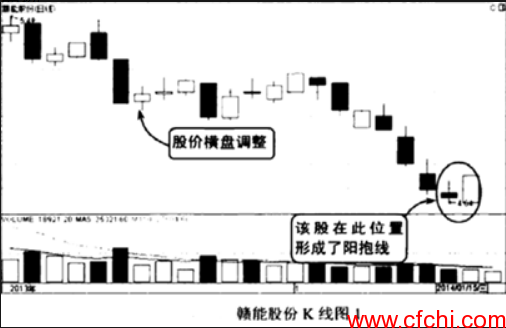 如图所示为赣能股份(000899)2013年12月到2014年1月的走势。从图中可以看出,该股前期出现了急速下跌,然后出现了横盘调整,说明市场出现了阻力,股价横向运行不久后又一轮缩量下跌,然后在图中椭圆区域,k线形成了一个很明显的阳抱线组合形态由此显示市场开始活跃、后市看涨,短线买入机会出现。