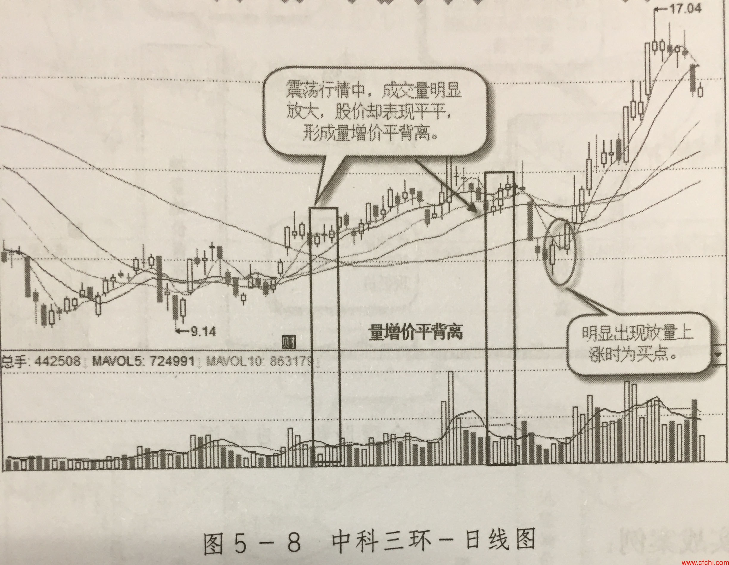 自前期下跌后,中科三环在2016年1月时步入震荡行情,并在2016年3月25日、28日、29日,以及4月29日、5月3日、4日,先后出现明显的成交量放大,股价却表现平平,形成量增价平背离。这说明主力在股价低位区,边打压股价, 一边逢低吸货,趋势即将出现反转。因此,投资者可逢低与主力一起建仓,或是等股价出现明显放量上涨,也就是启动时,选择买入,如图5-8所示。