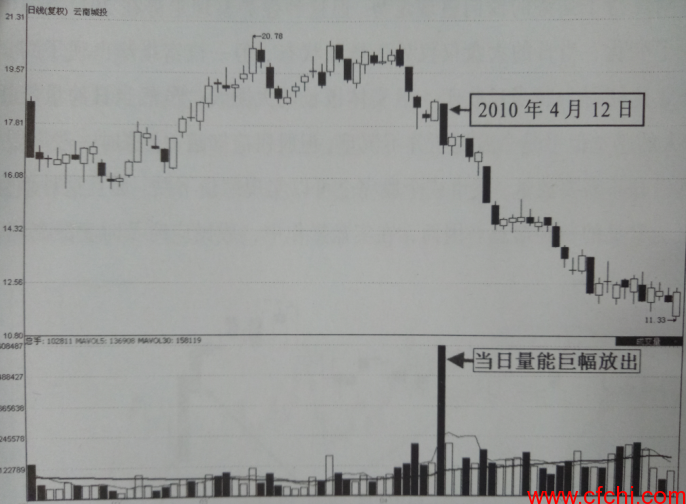 如图2所示为云南城投2010年1月26日至2010年5月21日期间走势图,此股在高位区出现了震荡走势,在一波下跌走势的开始阶段,因限售股上市而使得个股当日收于一根形态鲜明的放量大阴线,这正是个股随后将破位下行的信号,当然,它也是中短期内股民应及时卖股离场的信号。