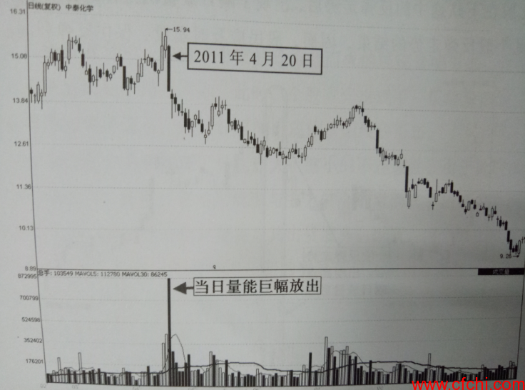 如图1所示为中泰化学2011年2月17日至2011年10月17日期间走势图,此股在高位盘整走势中,因限售股上市而出现了一根巨幅放量的阴线形态,当日量能的放大效果十分鲜明,这预示着大量的限售股正开始集中卖出,由于这只是一个开始阶段,因而,可以预计到,个股随后将在大量限售股的抛压下而破位下行。