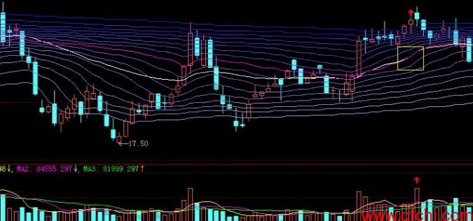 第二种情况就是均值没有上传中值,那么就说明难以突破顶值,而此时主力掌握的筹码是比较有限的,行情也即将向下调整,如下图所示。