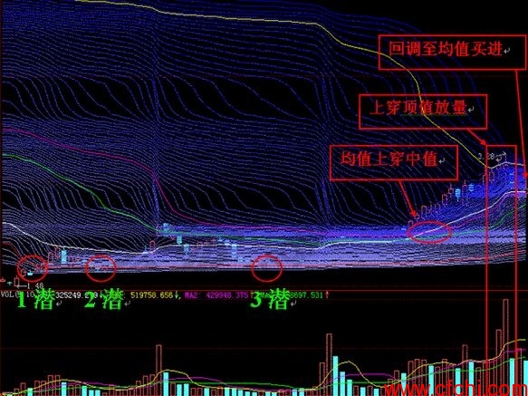 在潜龙出潭的过程中,三个低点要一个比一个高,而且底的数值开始上行。