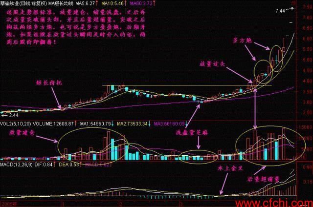 图形特征:(1)股价在冲过前一头部时放出巨大的成交量。(2)有时是单根巨大阳线,有时是温和放量的几根阳线,总之在冲过前头部时有成交量的配合。
