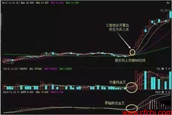 3、MACD的黄金交叉。不管是DIF、MACD是在0轴之上还是在0轴之下,当DIF向上突破MACD时皆为短中期的较佳买点,只不过前者为较好的买点,而后者仅为空头暂时回补的反弹。