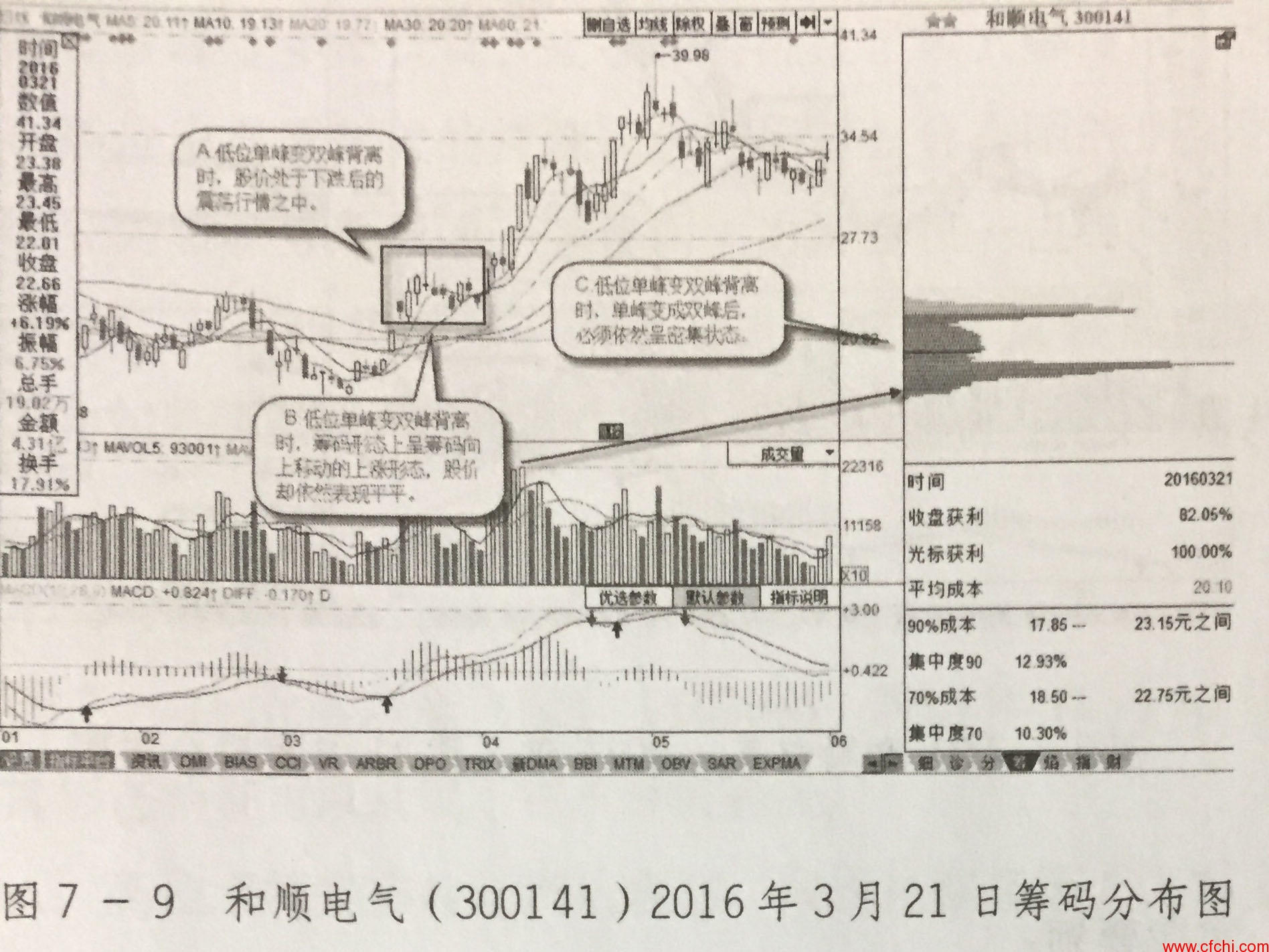 图7 - 9所示为和顺电气(300141) 2016年3月21日筹码分布图,其形态特征可以从以下三点分析确认。